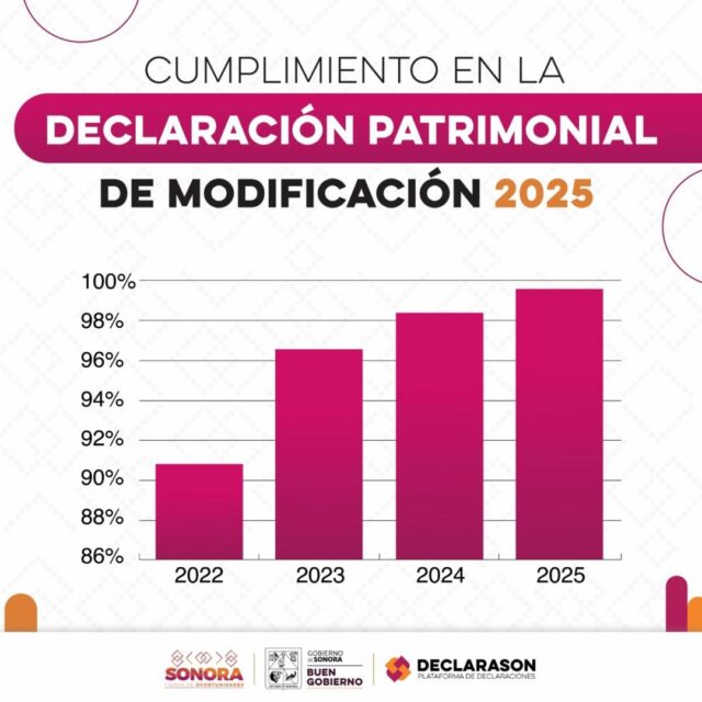 Hermosillo, Sonora. 02 de junio del 2025.- Con un 99.53 por ciento de cumplimiento, concluyó el periodo para presentar la Declaración Patrimonial de Modificación 2025, alcanzando un nuevo récord en la historia del Gobierno de Sonora en materia de transparencia y rendición de cuentas.