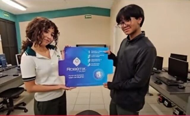 Hermosillo, Sonora. 16 de junio de 2025.- Danna Kamila Encinas Alcaraz y Geovanny Cabral Zavala, estudiantes del Colegio de Educación Profesional Técnica del Estado de Sonora (Conalep), junto con su asesora América Valenzuela, obtuvieron el segundo lugar en el concurso nacional “RobotiX.Faire 24-25”.