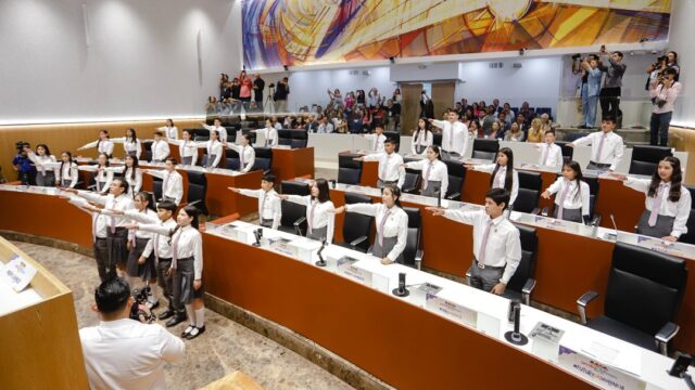 La bienvenida a las y los diputados infantiles se realizó en el recinto legislativo, seguida de la toma de protesta encabezada por el diputado Omar Francisco Del Valle Colosio (PVEM), presidente de la Mesa Directiva. Lo acompañaron Bernardeth Ruiz Romero, representante del titular del Poder Ejecutivo; Rosa Dolores López Carrión, magistrada del Supremo Tribunal de Justicia; Froylán Gámez Gamboa, secretario de Educación y Cultura; Nery Ruiz Arvizu, consejero presidente del Instituto Estatal Electoral; y Verónica Sandoval Castañeda, vocal ejecutiva del Instituto Nacional Electoral en Sonora.